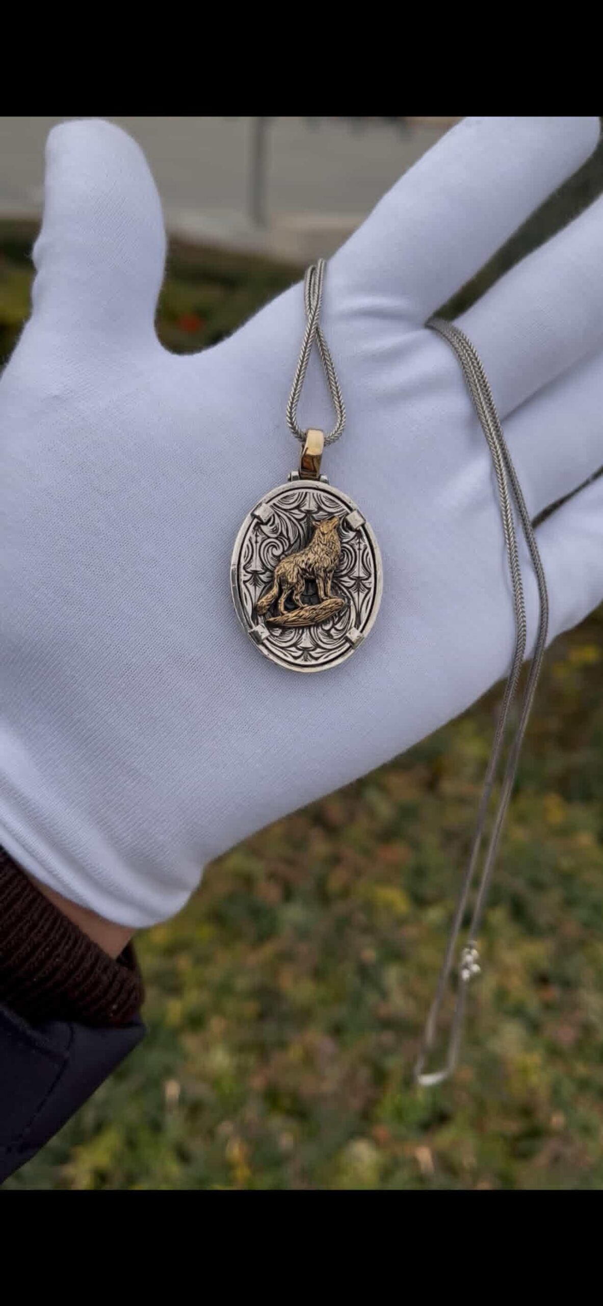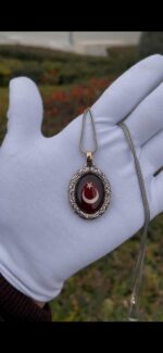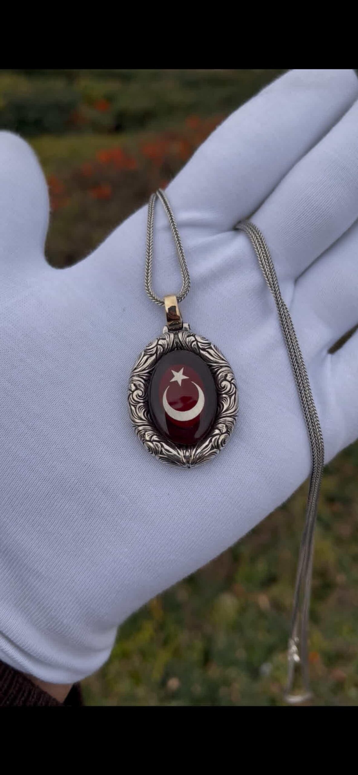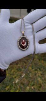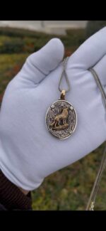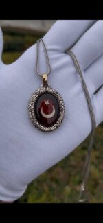 Ön yüzünde kırmızı kehribar taş içinde Ay Yıldız, arka yüzünde detaylı kurt figürü bulunan bu özel madalyon, tamamen el işçiliği ile hazırlanmıştır.